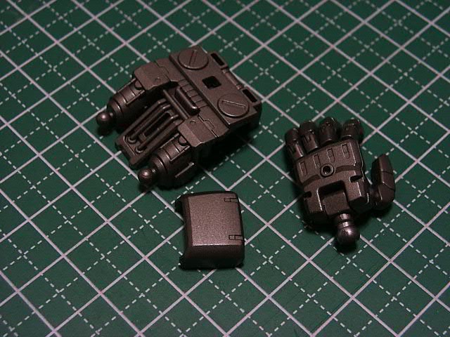 まずは中身のフレームから、シルバーとブラックを6:4ぐらいで混合そプシュシュッっと塗装、両肩・両足首のアクチュエーターをシルバー+クリアオレンジ&クリアイエローでいつものように塗装…両肩フレームの内側だから見えないの…そのほかは特になし…でもコアブロック入って無い状態の内部フレームって、骨格って感じ。