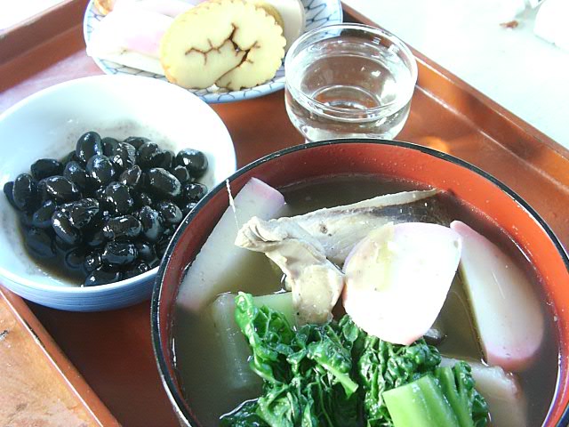 かしわ・鰤・ごぼう・かまぼこ・椎茸・人参・かぶ・餅、そしてかつお菜と結構がっつり系の雑煮であります。